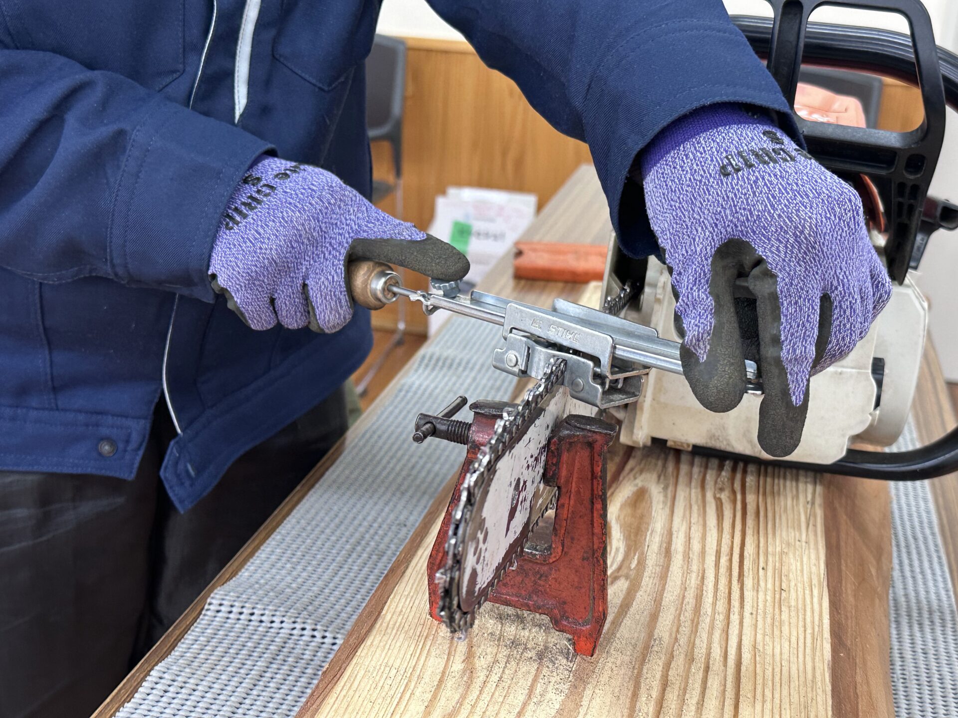 ソーチェーン取付チェーンソーの基本中の基本であるソーチェーンの取り付け。
